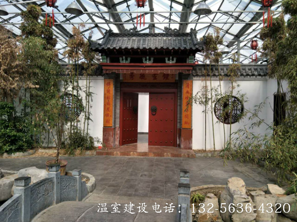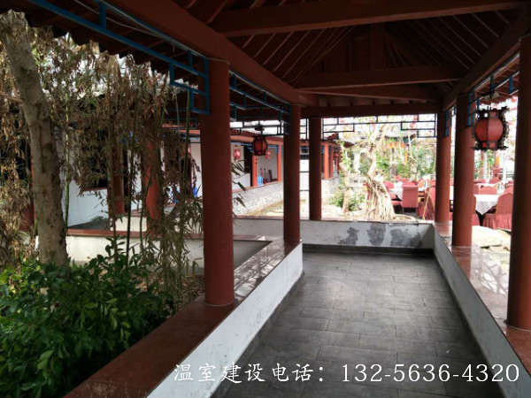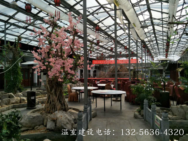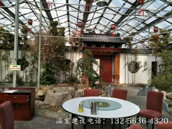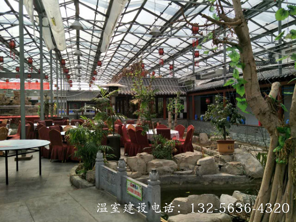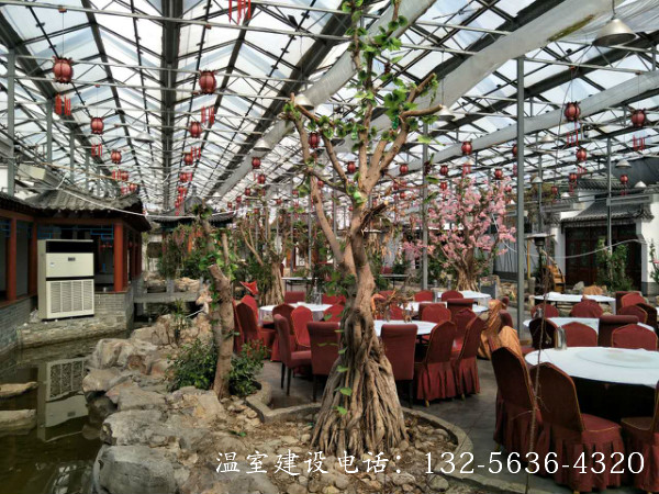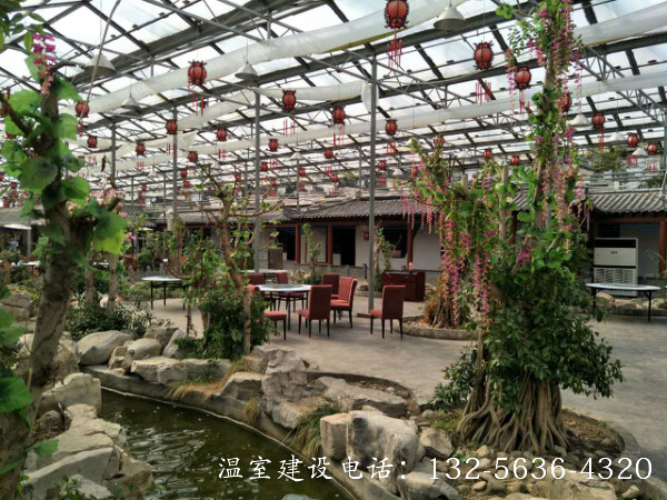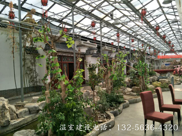 连栋温室生态餐厅是将餐厅建在温室中,并结合温室工程、园林景观设计、种植技术,营造出一种优美的生态自然景观环境,使生活在都市中的人们在品尝健康美食的同时,又能远离城市喧嚣,欣赏别具一格的自然美景’顾客能食用温室中生产的无公害绿色瓜果蔬菜. 更可参与其中,亲自采摘,增强了参与性与趣味性,其自然、幽雅的环境是其他餐厅所无法比拟的。