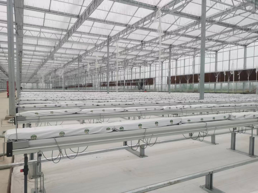 新型智能玻璃温室大棚首要由基础、立柱、主拱、副拱、天沟、门、电动顶卷膜、电动卷帘等部件组成。